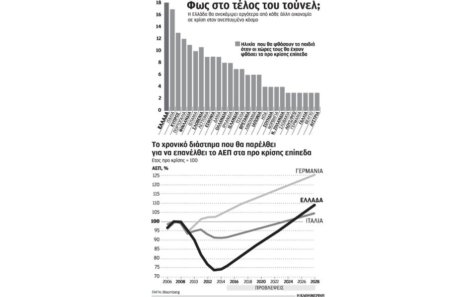 Σε αυτό το συμπέρασμα καταλήγει η έρευνα του πρακτορείου Bloomberg που βασίστηκε στις εκτιμήσεις και στα στοιχεία του Διεθνούς Νομισματικού Ταμείου (ΔΝΤ) για την ανάπτυξη μέχρι το 2020. Μάλιστα, τα σενάρια αυτά στηρίζονται στις εαρινές προβλέψεις του ΔΝΤ που δόθηκαν στη δημοσιότητα τον περασμένο Απρίλιο. Εκτοτε, η οικονομική προοπτική έχει επιδεινωθεί περαιτέρω, ειδικότερα στην Ελλάδα.